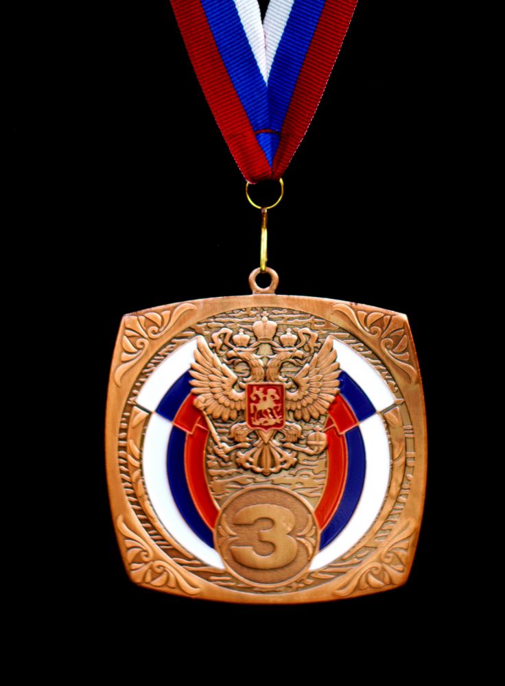 Большая наградная медаль элит класса квадратной формы с Российской символикой и цветной заливкой.