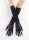 Женские длинные перчатки чёрного цвета из эластичного трикотажного полотна производства компании Sanset. Состав полотна -100% синтетические волокна. Подкладка - без подкладки. Отделка: четыре декоративных резинки, создающие сборки на предплечье. Возможность носить перчатки в полную длину и приспущенными к запястью. Расстояние от нижней точки большого пальца до края перчаток 25 см. На среднюю длину пальцев.
